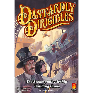 Dastardly Dirigibles features tarot-sized cards that are played in a constant action format in which each time a part is added, ALL players MUST add the SAME part – which may replace an existing one. Build your airship from different parts of nine beautiful suits, while also using special cards to your advantage or to thwart your opponents. The round ends when the first airship is complete — but you score only the suit used most in your airship. The player with the highest score after three rounds wins!